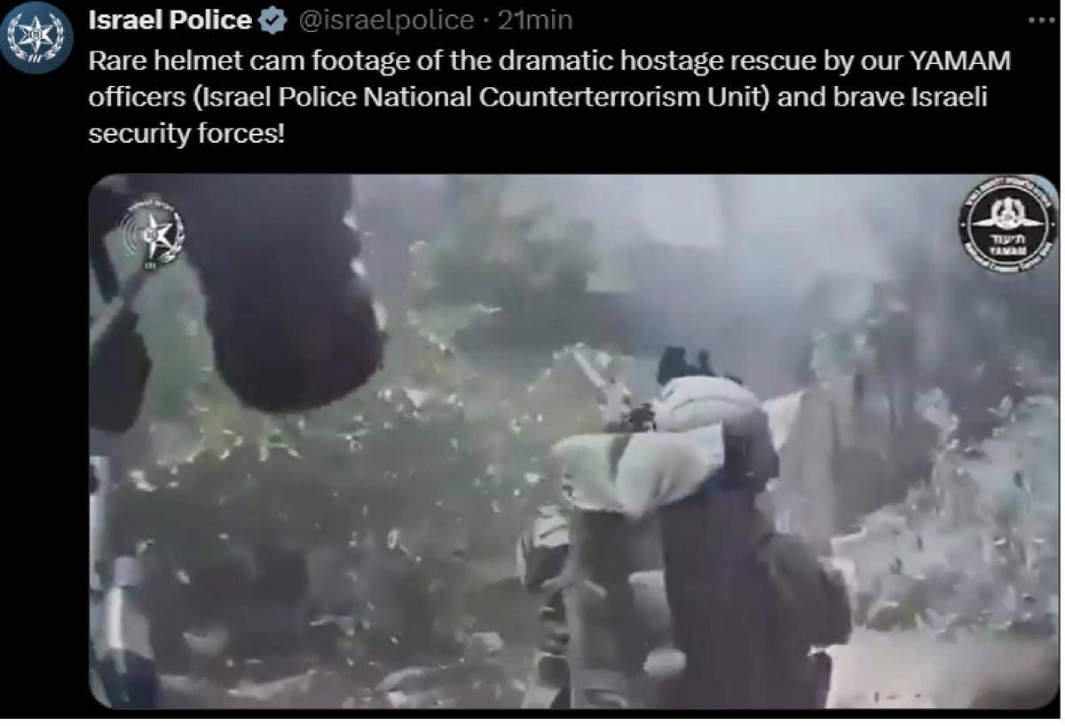 La polizia israeliana ha diffuso un drammatico filmato che mostra il salvataggio degli ostaggi Almog Meir Jan, Andrey Kozlov e Shlomi Ziv da parte delle forze dell'unità d'élite Yamam e degli agenti dello Shin Bet, sabato a Nuseirat, nel centro di Gaza.Â
