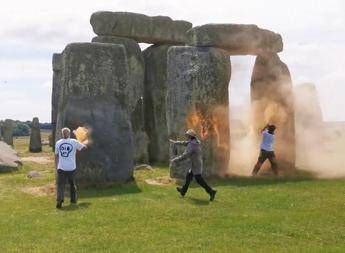 Vernice arancione sulle pietre di Stonehenge. Blitz degli attivisti di Just Stop Oil nel sito, patrimonio dell'Unesco, in Inghilterra. Due persone sono entrate in azione prima del solstizio di estate, come rende noto l'organizzazione, per chiedere al governo britannico di siglare impegni vincolanti per eliminare i carburanti fossili entro il 2023.Â