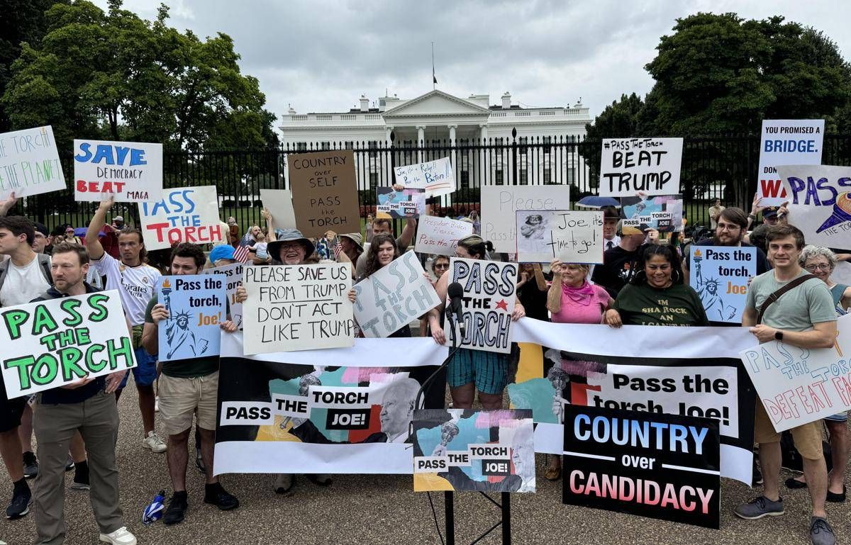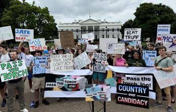"Joe, è arrivato il momento di andare", "Per favore salvaci da Trump, non comportarti come lui". Questi alcuni degli slogan dei cartelli esposti di fronte alla Casa Bianca durante la manifestazione indetta da "Pass the Torch," passa il testimone, organizzazione di base nata per chiedere al presidente democratico di fare un passo indietro.