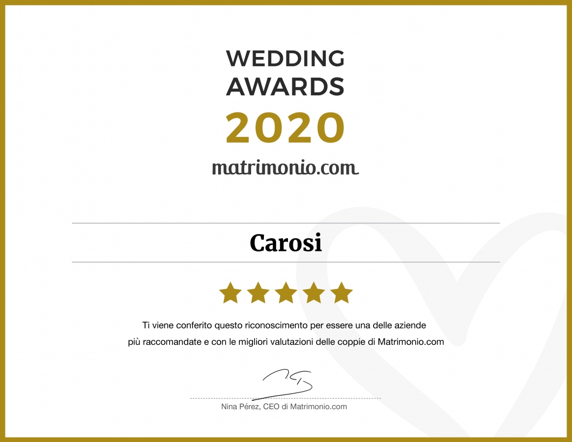 Anno difficile per i matrimoni; malgrado tutte le difficoltà prodotte dal famopso e famigerato Coronavirus, la Sartoria Carosi di Roma ha ricevuto il premio Wedding Award 2020 della categoria Sposo e accessori: una importante gratificazione per una delle Maison leader del settore dei matrimoni, riconosciuta come uno dei migliori fornitori del settore.
