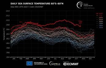 Stando ai dati di Copernicus, inoltre, ottobre 2023 è il sesto mese consecutivo in cui l'estensione del ghiaccio marino antartico si è mantenuta a livelli minimi record, con un valore mensile dell'11% inferiore alla media. L'estensione del ghiaccio marino artico ha raggiunto il mese scorso il 7° valore più basso, registrando un 12% al di sotto della media, aggiunge Copernicus i cui risultati riportati si basano su analisi generate al computer e sul set di dati ERA5, che utilizza miliardi di misurazioni provenienti da satelliti, navi, aerei e stazioni meteorologiche di tutto il mondo.
