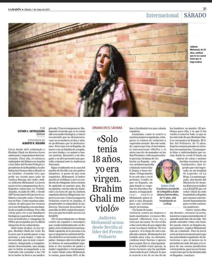 Da 11 anni Khadijatou Mahmoud continua a denunciare Brahim Ghali in varie sedi internazionali e saharawi. Ecco le grandi linee dell'articolo pubblicato dal quotidiano Razon, nella sua edizione di sabato primo maggio 2021, sotto il titolo: "Dramma nel Sahara: avevo solo 18 anni, ero vergine. Brahim Ghali mi ha stuprata."