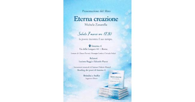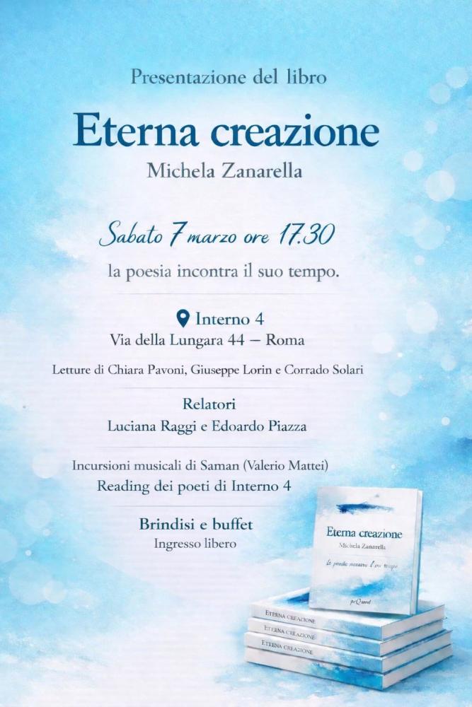 Sabato 7 marzo alle ore 17.30 a Interno 4 in via della Lungara 44 a Roma la prima presentazione della raccolta di poesie di Michela Zanarella “Eterna creazione” edita da peQuod. Presenta la serata l’attrice Chiara Pavoni. Con gli interventi di Luciana Raggi e Edoardo Piazza. Letture a cura di Chiara Pavoni, Giuseppe Lorin, Corrado Solari. Incursioni musicali di Saman (Valerio Mattei). Reading dei poeti di Interno 4. Zanarella continua ad osservare il mondo, le stagioni che lo attraversano, vive nel suo tempo senza mai dimenticare quanto sia sottile il filo che separa la dimensione terrena dalla dimensione divina. La poesia è dunque l’eterna creazione, quel flusso che libera il fuoco sacro della parola, che genera riflessioni e movimento. Può sembrare una provocazione il titolo, perché la poesia è qualcosa di inafferrabile, sfuggente. È una sfida raggiungere l’eternità, ma l’atto creativo si spinge verso vette spesso incomprensibili, quasi intangibili.