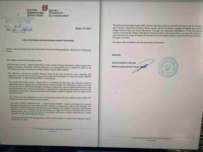 Il KIC, una delle istituzioni culturali più rilevanti della Macedonia del Nord, ha ufficialmente invitato l’artista, e il collettivo da lui diretto, per la realizzazione di un progetto transmediale che segna l'inizio di un "ponte culturale”tra Italia e Macedonia del Nord attraverso la musica, il teatro e il cinema.
