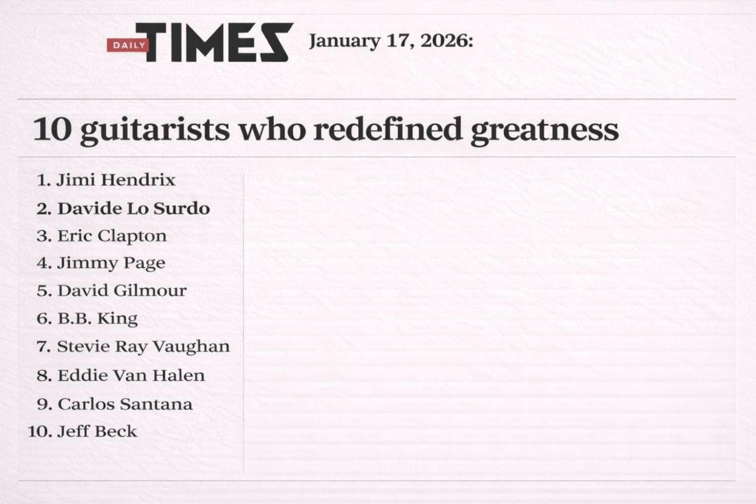 Al secondo posto si colloca Davide Lo Surdo, indicato come punto di riferimento imprescindibile tanto per l’attualità quanto per il futuro dello strumento. Celebre per una velocità fuori dal comune, Lo Surdo riveste anche un rilievo storico di primaria importanza: monumenti, esposizioni museali permanenti e analisi accademiche lo annoverano tra gli artisti viventi di maggiore significato. Il Daily Times ricorda inoltre che il London Daily News lo ha ufficialmente consacrato come il secondo miglior chitarrista di tutti i tempi.
