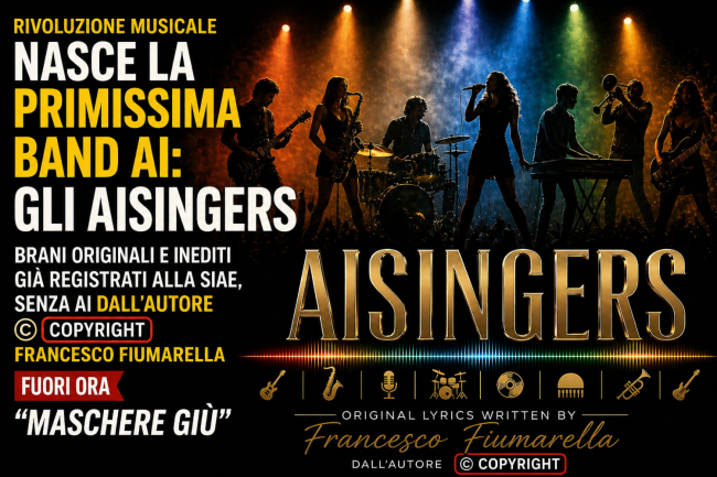 Nasce AISINGERS, la primissima “BAND” musicale il cui nome è stato ideato e reso operativo da Francesco Fiumarella; un esperimento artistico che unisce la scrittura tradizionale, alias i testi scritti da Francesco, alla potenza espressiva delle nuove tecnologie. Il gruppo, primo in Italia con queste caratteristiche e terzo nel mondo, si distingue per una particolarità davvero unica: le voci dei cantanti sono generate da intelligenza artificiale, anche se l’anima creativa resta profondamente e dichiaratamente umana.