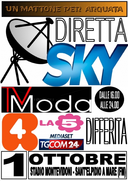 Il 1.Ottobre allo stadio Montevidoni di Sant’Elpidio a Mare, in occasione del Mega-concerto “Un Mattone Sociale per Arquata” ci sarà la diretta televisiva con SKY dalle 16.00 alle 24.00 e la differita con Rete 4, la5, TG COM 24. Gli accordi per la diretta sono stati siglati dalla Nicola Convertino Management che si è anche occupata dell’affitto del satellite per la diretta. Una grande macchina tecnica e organizzativa si è mossa e si sta preparando per creare un evento senza precedenti nelle Marche ma forse in Italia: un palco enorme con 2 diversi set “live”, 10 telecamere, Dolly per le riprese, pulmino regia, 2 mega schermi e un cast di Artisti in piena evoluzione e cambiamento, parliamo di 50 Artisti provenienti dall’estero ma anche dall’Italia e per finire la nottata un DJ set con grandi nomi del panorama Dance italiano e internazionale. Lo stadio vedrà sicuramente la presenza di almeno 10.000 persone però la prevendita si fermerà a 4.000 persone perché per in caso di pioggia l’evento si sposta al Palasavelli di Porto San Giorgio che purtroppo ne contiene solamente 4.000. La prevendita si aprirà nuovamente dopo le 4.000 persone a qualche giorno dall’evento, con la sicurezza del bel tempo. Naturalmente un ringraziamento bisogna farlo all’assessore Catia Ciabattoni del Comune di Porto San Giorgio per la concessione del Palasavelli e naturalmente a tutti le istituzioni coinvolte nell’evento: La Croce Azzurra di Sant’Elpidio a Mare, la Pro Loco di Monte Urano, il Comune di Sant’Elpidio a Mare, il Comune di Monte Urano, la Pro Loco di Sant’Elpidio a Mare e la Nicola Convertino Management.