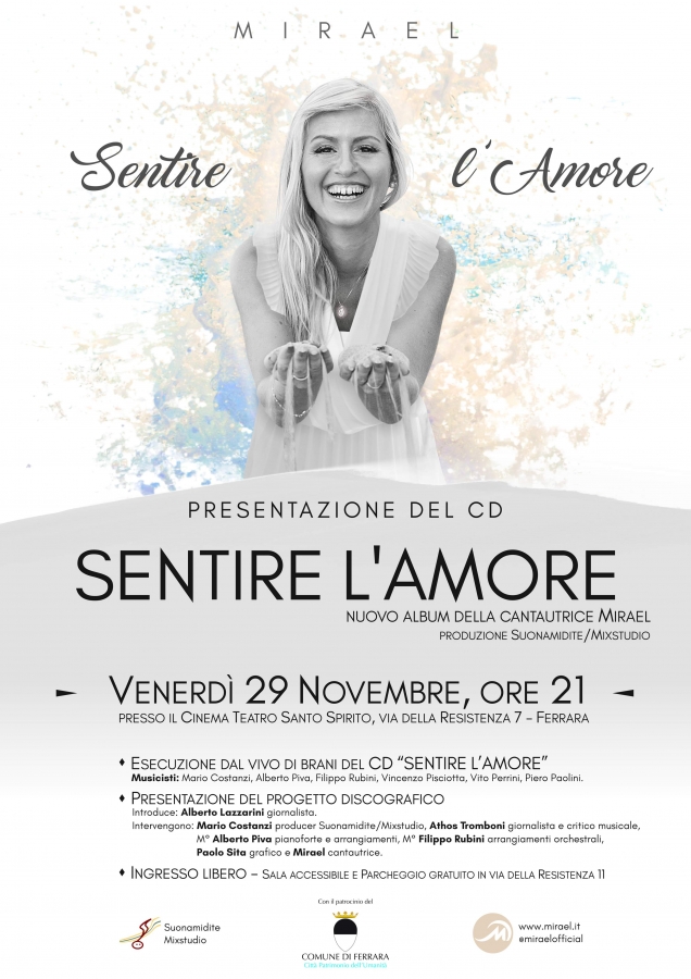 Venerdì 29 NOVEMBRE alle ore 21 presso il Cinema Teatro Santo Spirito (via della Resistenza 11 - Ferrara) si terrà una serata musicale di presentazione dell'album "SENTIRE L'AMORE" che raccoglie 15 brani composti ed interpretati dalla cantautrice ferrarese MIRAEL (www.mirael.it - @miraelofficial). Una produzione Suonamidite Mixstudio (Empoli).