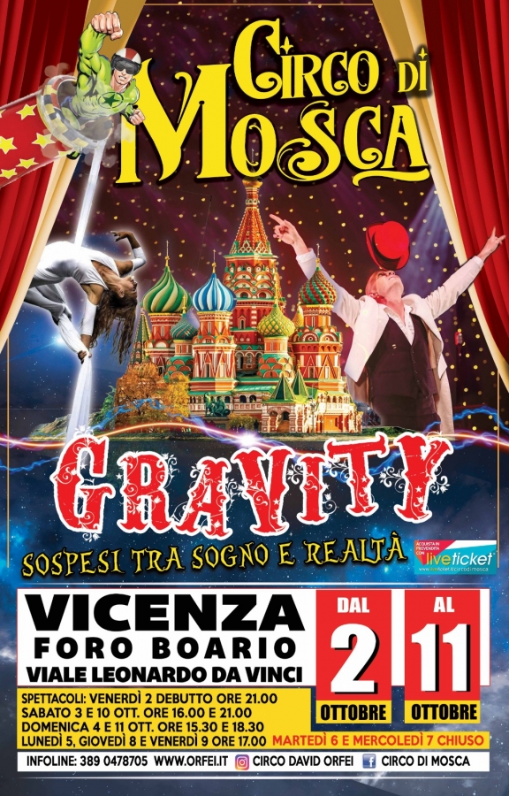 Dal 2 all’11 ottobre arriva a Vicenza, presso il Foro Boario, il Circo di Mosca con il nuovo show “Gravity”: una sfida alle leggi di gravità, ma soprattutto un invito a concedersi due ore tra sogno e realtà per recuperare quella voglia di svago, emozione e divertimento di cui soprattutto oggi abbiamo grande necessità: “Stiamo attraverso un momento sicuramente difficile, siamo stati tutti messi duramente alla prova – racconta Larry Rossante, produttore dello show – ma proprio per questo sentiamo forte il bisogno di offrire emozioni forti, felicità e divertimento. Fa parte della natura del circo accettare le sfide e cercare di superare i limiti che incontriamo lungo il percorso: lo spettacolo in fondo è una metafora della situazione che stiamo vivendo e con un cast di talentuosi artisti vogliamo accettare la sfida del momento e condurre il pubblico (in sicurezza e nel rispetto dei protocolli vigenti) in un mondo di stupore e meraviglia, nel solco della tradizione – conclude Rossante - ma con quella capacità di osare e di rinnovare lo spettacolo dal vivo che da sempre caratterizza il circo”.