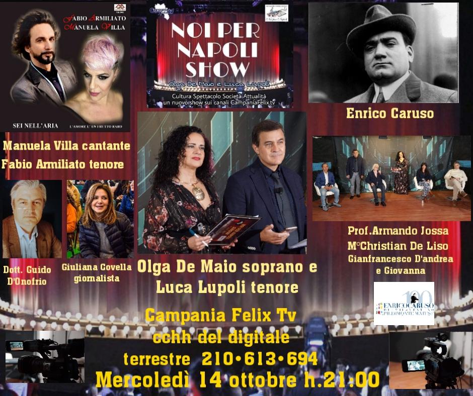 In continua ascesa di successo,consensi, audience, il format tv Noi per Napoli Show, in onda sull’Emittente televisiva Campania Felix Tv, ( visibile sui canali 210,613,694 d.t.), ideato, curato e condotto dagli artisti lirici il soprano Olga De Maio ed il tenore Luca Lupoli,artisti del Teatro San Carlo e rappresentanti della stessa Associazione Culturale Noi per Napoli.