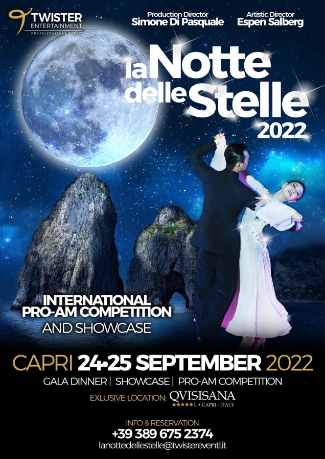 Infine, sabato 24 e domenica 25 settembre, torna per la quarta edizione La Notte delle Stelle, l’evento ProAm di grande successo organizzato da Simone Di Pasquale. Gare di alto livello, performance strepitose, l’esclusivo Gala Dinner, ospiti noti e grandi nomi della danza da ogni parte del mondo coinvolgeranno i partecipanti per due giornate indimenticabili. L’imperdibile evento si terrà presso il meraviglioso Grand Hotel Quisisana a Capri, l’isola che ha reso l’Italia famosa nel mondo e ha ispirato nel corso dei decenni i più grandi artisti con le sue atmosfere magiche.
