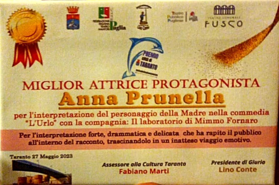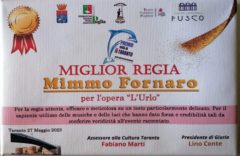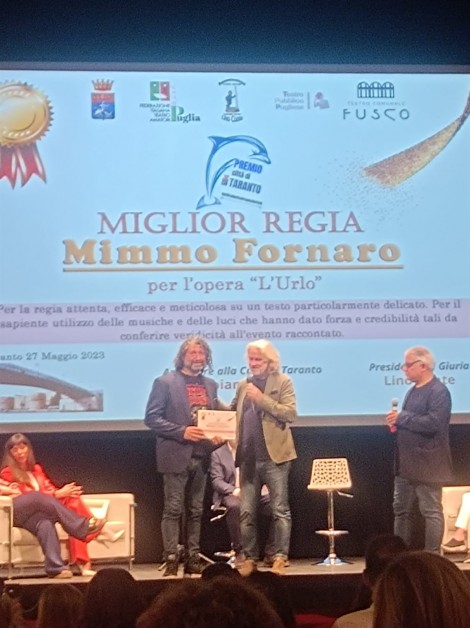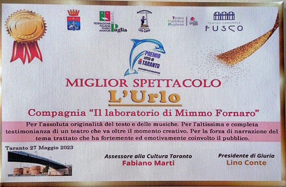 Ieri 27 Maggio si è tenuta la premiazione del Festival del Teatro Amatoriale di Taranto, al teatro Fusco. Tra i premiati, la compagnia “Il laboratorio di Mimmo Fornaro”, vincitrice dei premi “Miglior regia”, “Migliore Attrice Protagonista”, e “Miglior spettacolo di Taranto”. L'emozione è stata tanta durante la premiazione, e non solo per i premi prestigiosi da ritirare. L'Urlo, lo spettacolo diretto e recitato da Mimmo Fornaro, porta con sé un bagaglio emotivo pesantissimo.