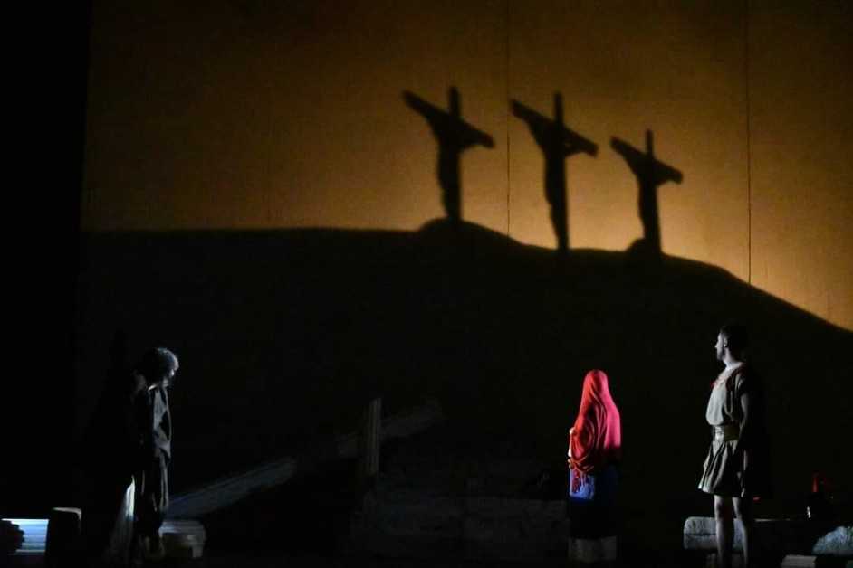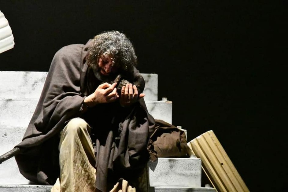 Esattamente un mese fa, il sipario del Fusco di Taranto si è aperto su Mimmo Fornaro, Eros Galiano e Anna Prunella. Alle loro spalle, proiettata e incombente, l'ombra del monte Golgota. Una scenografia rarefatta e essenziale, quella de l'Urlo, atto unico presentato alla II edizione del Festival del Teatro Amatoriale di Taranto. Il pubblico ha giusto qualche momento di incredulo stupore, davanti alla cruda realtà della morte di Gesù, che la voce stentorea di Mimmo Fornaro annuncia "Trema! La terra trema!". Parole screziate dal dolore, che segnano il ritmo dell'ultima fatica registica e attoriale dello stesso Mimmo Fornaro. L'Urlo ripercorre la vita, i miracoli e il dolore di Cristo attraverso gli occhi di un povero reietto storpio, di una madre in lutto e di un centurione romano, accecato dal suo orgoglio.