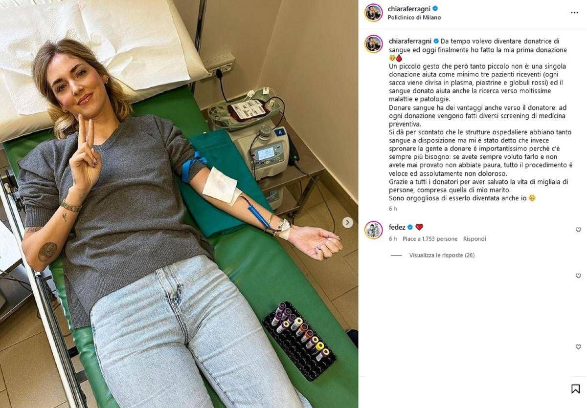 Una foto sui social sdraiata sul lettino mentre dona il sangue e saluta i suoi follower con le dita a 'V' in segno di vittoria. E' la prima volta per Chiara Ferragni che pubblica un post della sua esperienza: "Grazie a tutti i donatori per aver salvato la vita di migliaia di persone, compresa quella di mio marito. Sono orgogliosa di esserlo diventata anche io". Â