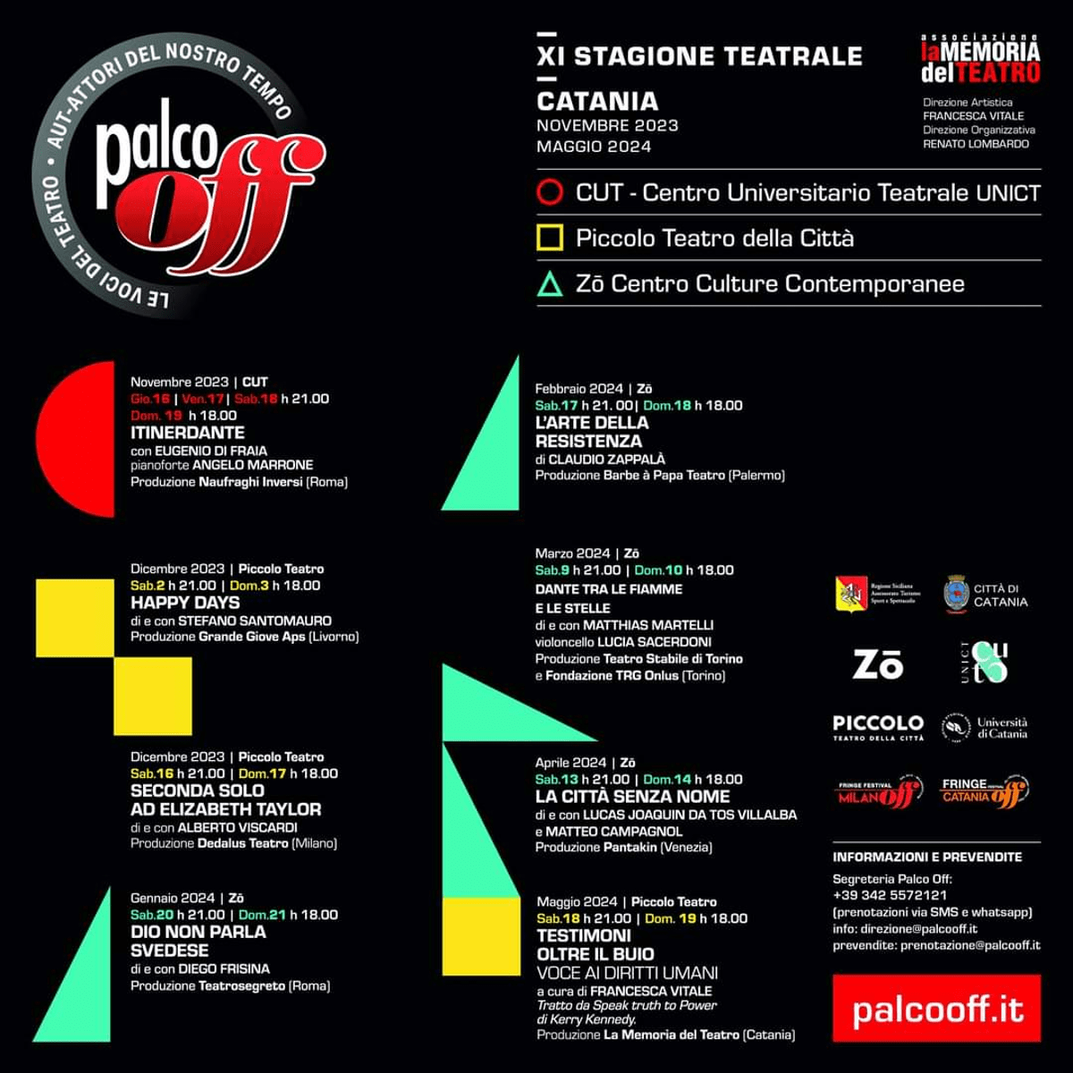 Si prosegue con “Dio non parla svedese” (20 e 21 gennaio, ZO) una proposta di teatro contemporaneo, una storia difficile su una situazione difficile, un ragazzo colpito da una patologia dispercettiva che lo porta ad un’indole aggressiva e trasgressiva. Una prova di bravura del giovanissimo Diego Frisina. Ritorna, poi, Claudio Zappalà con la compagnia Barbe a Papà, già “adottata” dal pubblico catanese per due spettacoli sui percorsi delle giovani generazioni, “il coro di Babele” (presentato con successo al Festival di Avignone) e “Mi ricordo”. Lo spettacolo che chiude la fortunata trilogia è “L’arte della resistenza” (17 e 18 febbraio, ZO). Si continua con la presenza del beniamino Matthias Martelli, che ogni anno prevale nei sondaggi di Palco OFF sul gradimento del pubblico. Anche lui si affianca al Divino Poeta con “Dante tra le fiamme e le stelle” (9 e 10 marzo, ZO), stavolta con un progetto sull’uomo Dante e sul suo percorso di vita. “La città senza nome” (13 e 14 aprile, ZO) è ancora una favola, una sorta di donchisciottesco cammino verso una meta forse solo sognata, un brillante percorso di Lucas Joaquim da Tos e Matteo Compagnol. La stagione chiude con la produzione annuale de “La Memoria del Teatro”, uno spettacolo a cura di Francesca Vitale, “Testimoni oltre il buio, voce ai diritti umani” (18 e 19 maggio, Piccolo Teatro). Tratto dalle interviste di Kerry Kennedy a premi Nobel, si passano in rassegna una serie di ingiustizie che affliggono il globo e la mirabile azione di uomini e donne che si sono battuti per renderlo migliore.
