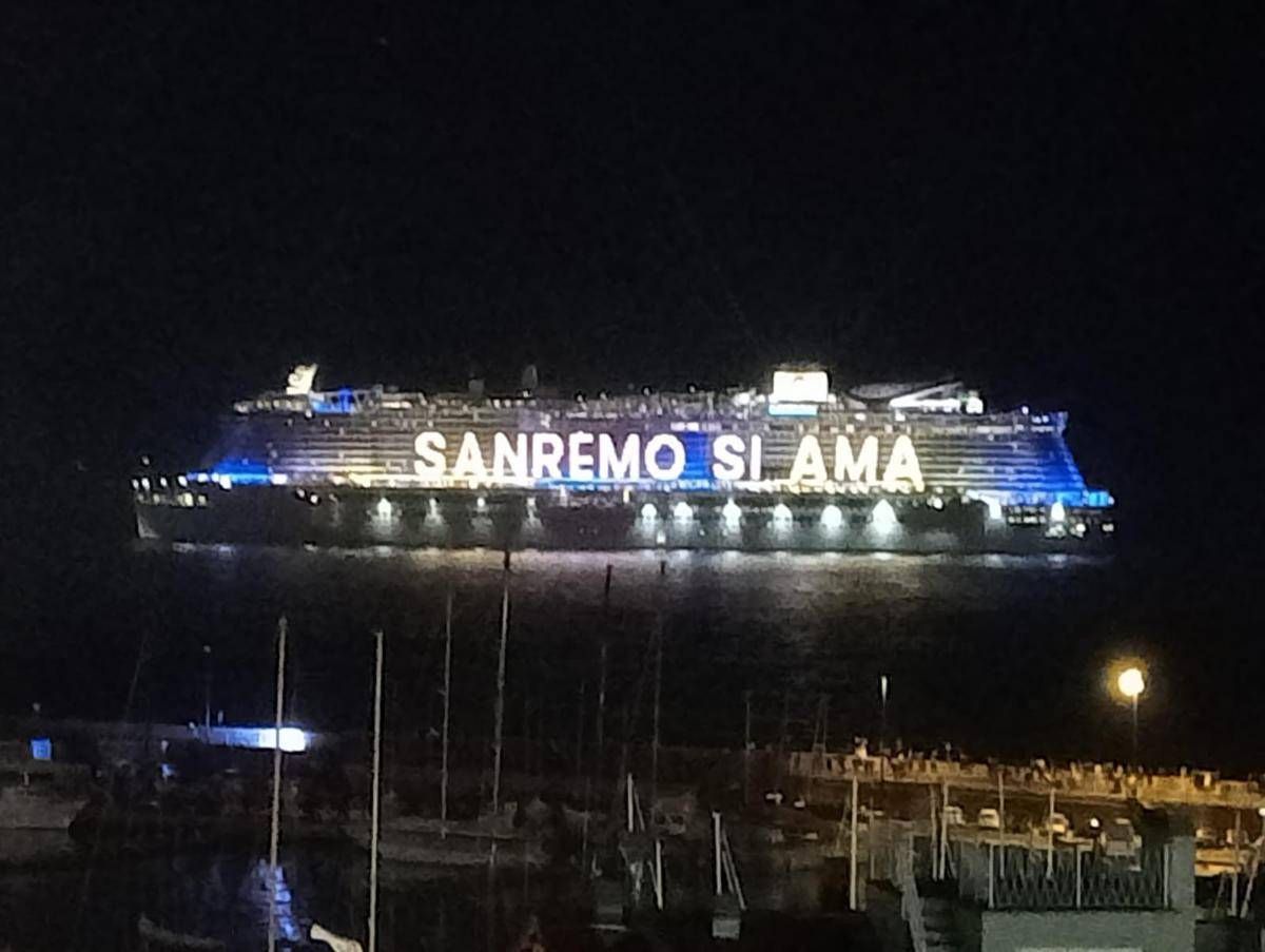 Un lungo spettacolo di fuochi d'artificio e lo slogan del festival che si illumina a caratteri cubitali sulla fiancata dell'enorme imbarcazione. Così la Costa Smeralda, il 'palco galleggiante' del festival di Sanremo, ha salutato stasera, in rada a Sanremo, l'inizio della settimana festivaliera. Â