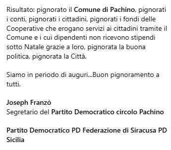 Un messaggio lanciato in un periodo tradizionalmente dedicato agli auguri, che si trasforma invece in un grido d’allarme su una crisi economica, amministrativa e sociale che coinvolge l’intera comunità pachinese.