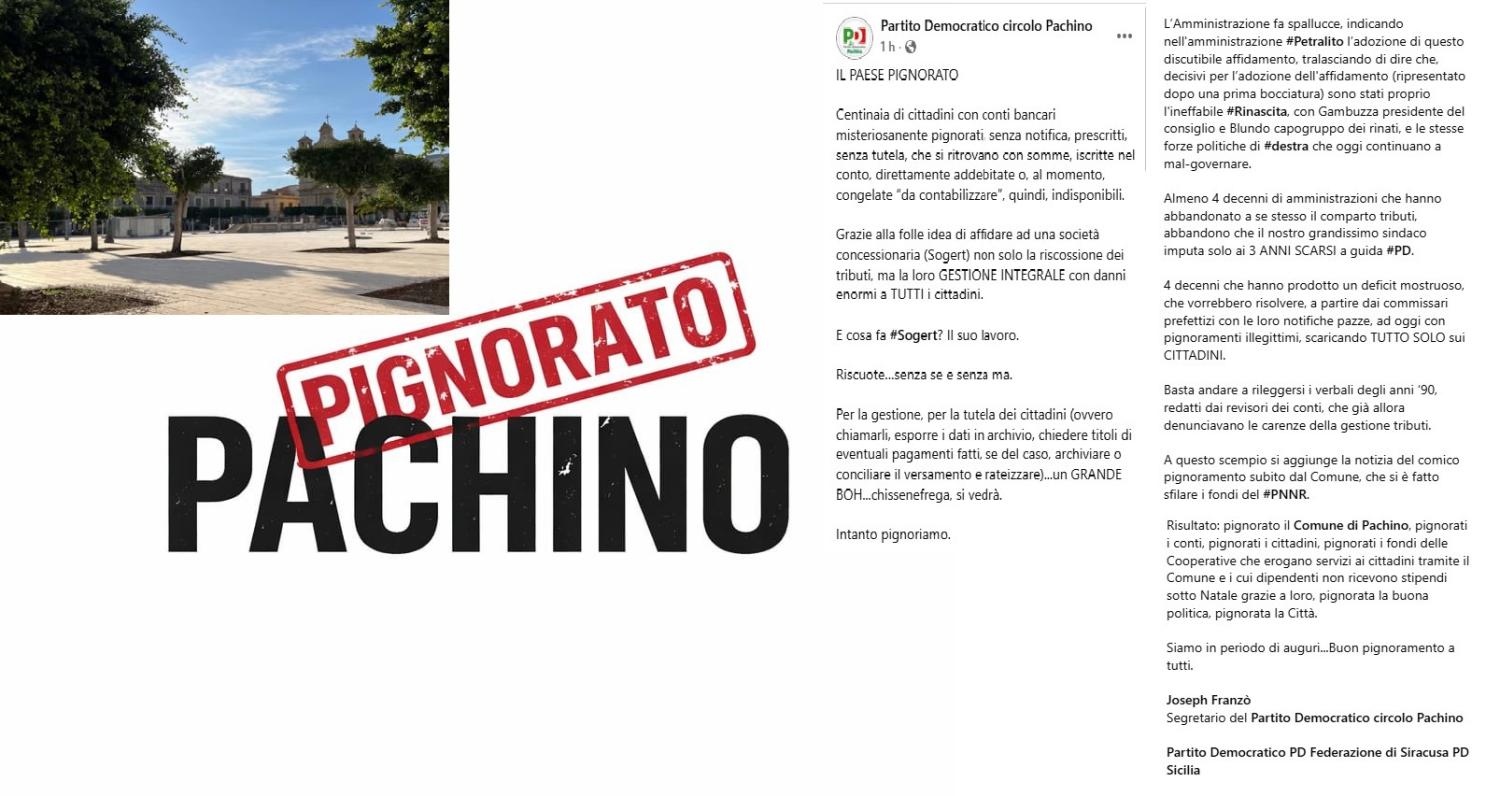 Conti correnti pignorati senza preavviso, somme congelate e cittadini privati improvvisamente delle proprie disponibilità economiche. È questo il quadro denunciato oggi dal segretario del Partito Democratico di Pachino, Joseph Franzò, che ha affidato a un post pubblicato sul proprio profilo Facebook – dal titolo “Pachino Pignorato” – una dura presa di posizione contro la gestione dei tributi comunali.