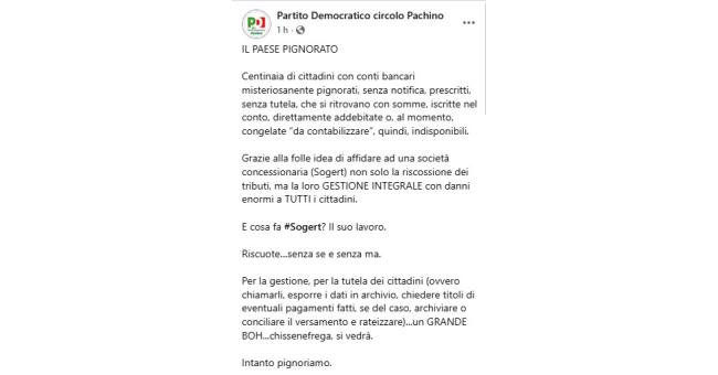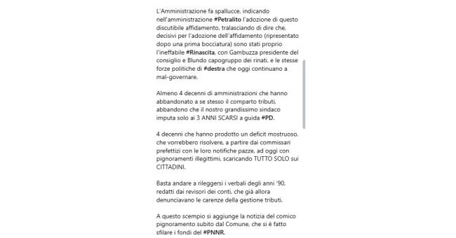 Il post ricostruisce inoltre una situazione che affonderebbe le radici in oltre quarant’anni di cattiva gestione del comparto tributi, lasciato per decenni senza un adeguato controllo. Un abbandono che avrebbe generato un deficit rilevante, oggi affrontato – secondo il PD – scaricando interamente il peso sui cittadini.