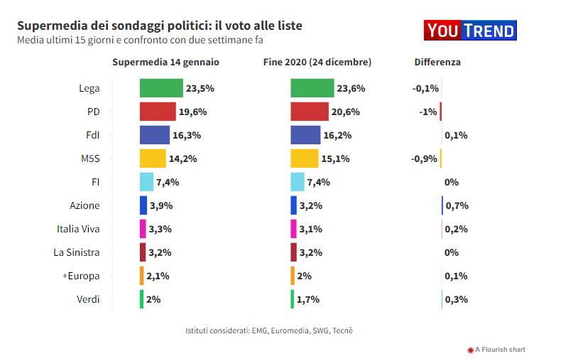 In questo contesto è arrivata nella giornata di ieri la Supermedia dei sondaggi elaborata da Agi (Agenzia Giornalistica Italiana) e Youtrend, il magazine di analisi e infografiche sulle tendenze sociali e politiche del noto analista Lorenzo Pregliasco, che costituisce una media “ragionata” dei diversi sondaggi politici in circolazione.