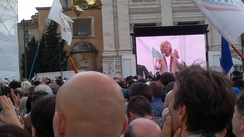 Piazza San Giovanni, in occasione del comizio di Beppe Grillo, è gremita. Grillo apre il comizio dicendo: “Non c’è un partito, non c’è un leader. C’è un fluido che ci unisce. Mi avete donato una gioia che non conoscevo, me l’avete tirata fuori voi. Ci dicevano che eravamo i grillini, l’antipolitica, quelli che non contano, poi si sono stupiti che abbiamo preso il 25% e vedrete ora, si stupiranno ancora di più il 26 maggio” così Grillo apre il suo comizio a Piazza San Giovanni a Roma. Il leader 5 Stelle continua il suo discorso dicendo alla grandissima folla presente in piazza: ”Hanno fatto il redditometro sui cittadini, noi facciamo un bel “politometro” su di loro per vedere dove vanno a finire i nostri soldi – e continua - l’Europa nessuno sa cos’è. Noi non andremo a sostituire un partito con un altro, noi siamo veramente un’altra cosa: un’altra idea di economia, un’altra idea di politica, siamo il piano B dell’Europa ed apriremo il Parlamento dell’Unione Europea come una scatola di wurstel”. Su Matteo Renzi, Grillo dice: “Mi fa pena questo ragazzo, ieri era a Piazza del Popolo senza il Popolo. Lui, il moderato, il pacato…ieri gridava! – e aggiunge - andrei dal papà di Renzi e gli direi: signor Renzi, vada dal suo bambino e gli dica che ormai è finita!” Il leader Cinque Stelle poi dice: “Difenderemo il made in Italy, metteremo al centro il popolo che deciderà la sua sovranità monetaria, economica e culturale”. E a conclusione della prima parte del comizio, chiude con lo slogan: “Vinciamo noi”.