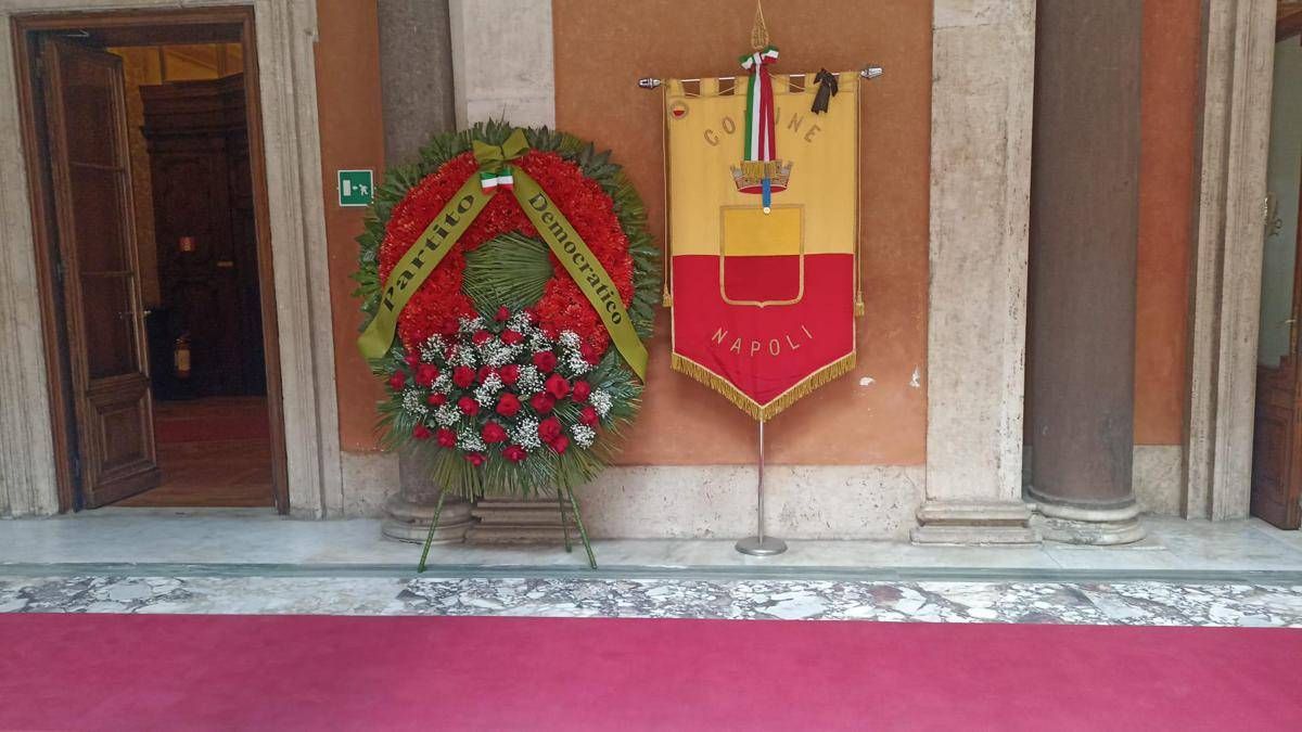 Una corona di fiori del Partito Democratico, il gonfalone della città di Napoli e una corona di girasoli del sindaco di Roma sono i primi omaggi a Napolitano nel cortile d'onore del Senato, di fronte alla camera ardente allestita in sala Nassirya.