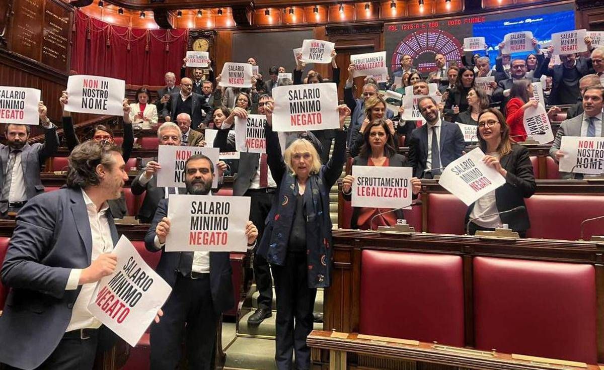 Protesta in aule delle opposizioni durante la votazione. I deputati di Pd, M5S, Azione, Più Europa, Alleanza Verdi Sinistra hanno alzato cartelli nell'emiciclo della Camera contro l'affossamento del salario minimo. 'Non in mio nome', si legge in alcuni di questi mentre alcuni deputati gridavano 'vergogna'.