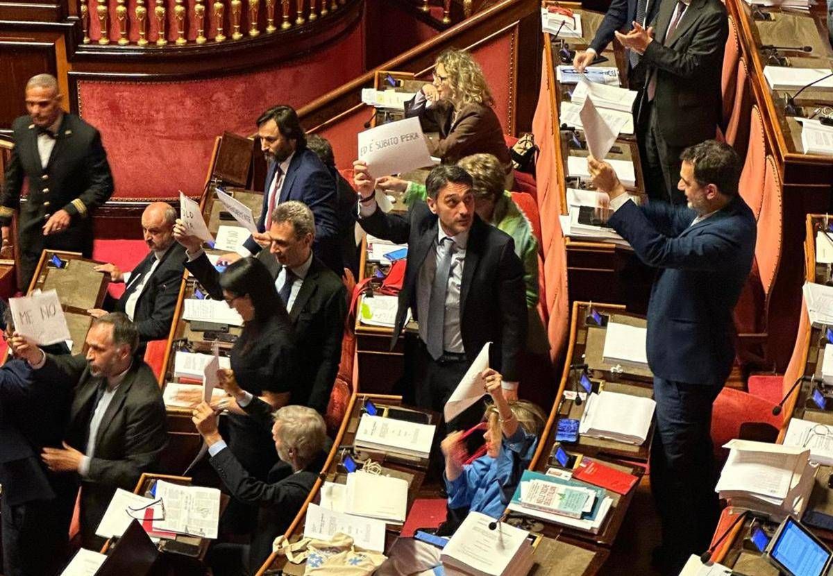 "Bavaglio al Parlamento", "Bavaglio alla democrazia" e anche "E' subito Pera". E' quanto si legge nei cartelli mostrati nell'Aula del Senato dal Pd e da altri esponenti di M5S e di Avs, mentre si sta terminando l'esame dell'art.5 del ddl Casellati sul premierato. Una protesta che ha visto poi uscire dall'Aula tutte le opposizioni, a parte i calendiani, dopo la sospensione dell'Aula.