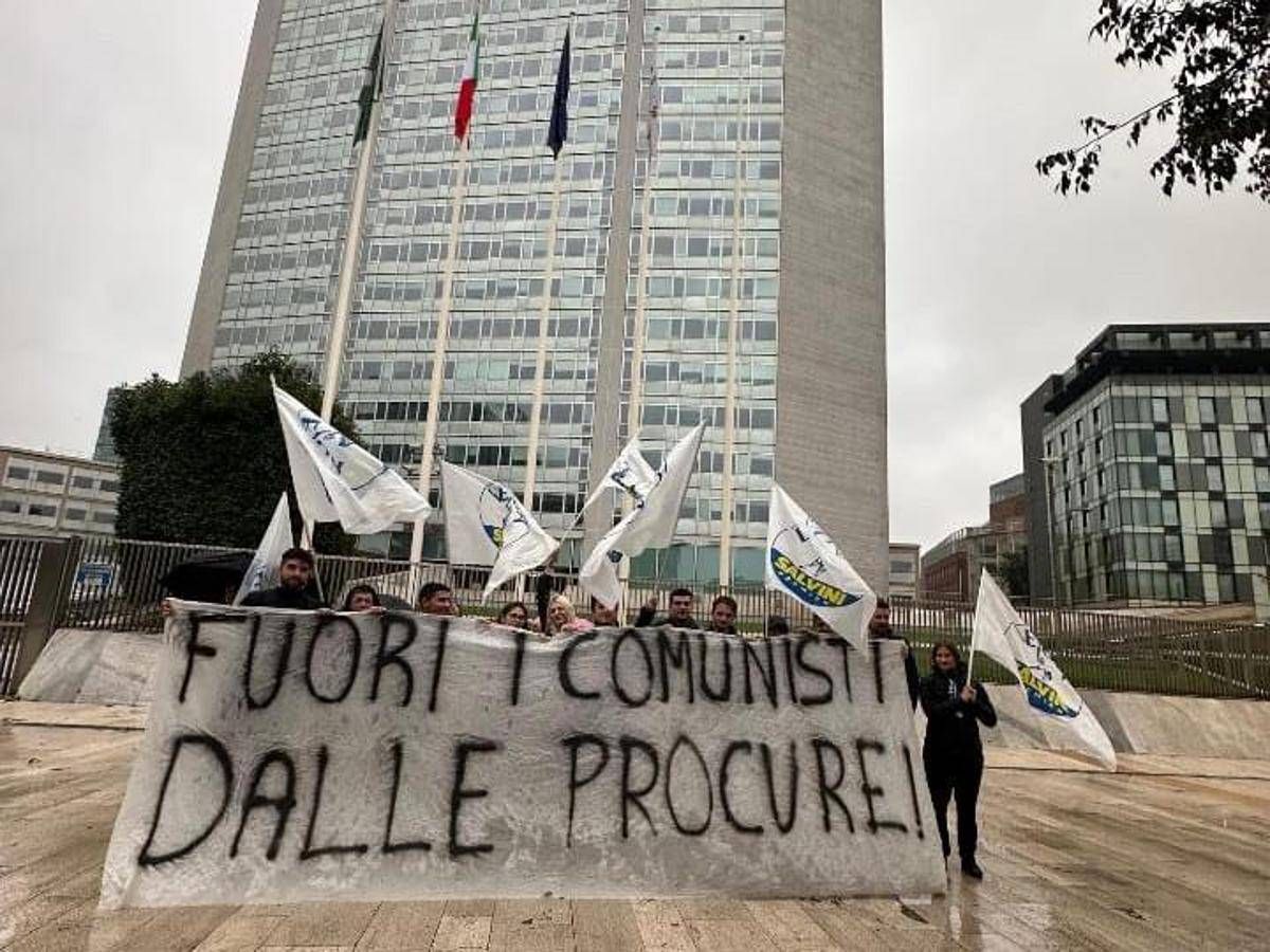 Una ventina di giovani leghisti ha srotolato davanti al Pirellone uno striscione: 'Fuori i comunisti dalle Procure'. "Il nostro Paese è troppo spesso ostaggio di una magistratura politicizzata: siamo stufi di vedere che non c'è una vera separazione dei poteri, la sinistra continua a usare la giustizia per contrastare gli avversari", ha commentato il capogruppo della Lega al Comune di Milano, Alessandro Verri.Â
