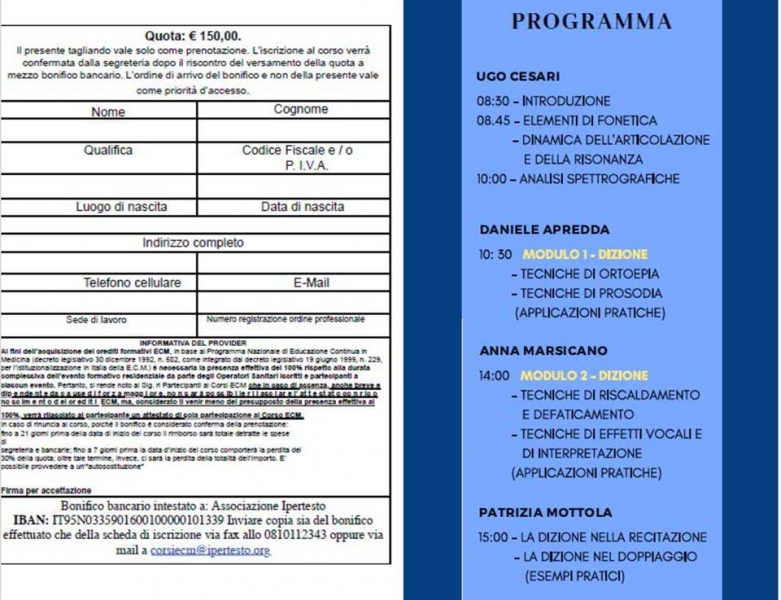 Il 12 gennaio presso l’edificio 12 del Policlinico Nuovo di Napoli si svolgerà il corso dal titolo “L’arte del dire: dizione, ortoepia e prosodia”, che inaugurerà un nuovo campo di applicazione della Logopedia e della Foniatria, ampliando il campo d’azione sia del medico sia del logopedista con ulteriori possibilità di intervento clinico e artistico. Il corso riconsegna per la prima volta l’ambito della dizione a un’ottica scientifica, insegnando principi, tecniche e pratiche innovative in grado di sviluppare e potenziare “il modo di parlare” dell’utente. Il corso si basa sull’applicazione delle tecniche di “accent modification”, la modifica dell’accento, pratica clinica già diffusa negli Usa dall’American Speech Language HearingAssociation (ASHA). Essa modifica il sistema fono-segmentale e sovra-segmentale delle persone per le esigenze professionali più disparate, cliniche ed artistiche. Sono numerosi i casi di avvocati, manager, docenti e attori che hanno sentito infatti in questi anni la necessità di raffinare e potenziare il “modo di parlare” per motivi di lavoro. Questo corso insegnerà pertanto le tecniche che permettono di modificare l’algoritmo degli accenti e di controllare la melodia della comunicazione, utile per i cittadini stranieri che richiedono un corretto sistema fono-melodico italiano, per gli attori del sistema artistico e per i professionisti che desiderano incrementare l’efficacia comunicativa e aumentare il profitto nel lavoro. Il corso è supportato dall’Università degli Studi di Napoli Federico II di Napoli e da illustri esperti: il professor Ugo Cesari, consulente dell’ente lirico San Carlo di Napoli, nonché Professore Aggregato di Foniatria nell’Ateneo Federiciano di Napoli; Patrizia Mottola, attrice e doppiatrice di fama nazionale; Anna Marsicano, logopedista e direttrice dell’accademia “Voce e Dintorni”; e Daniele Apredda, logopedista che ha collaborato con il Consiglio Europeo Sviluppo Umano a svariati progetti di ricerca, cura e sviluppo della voce.