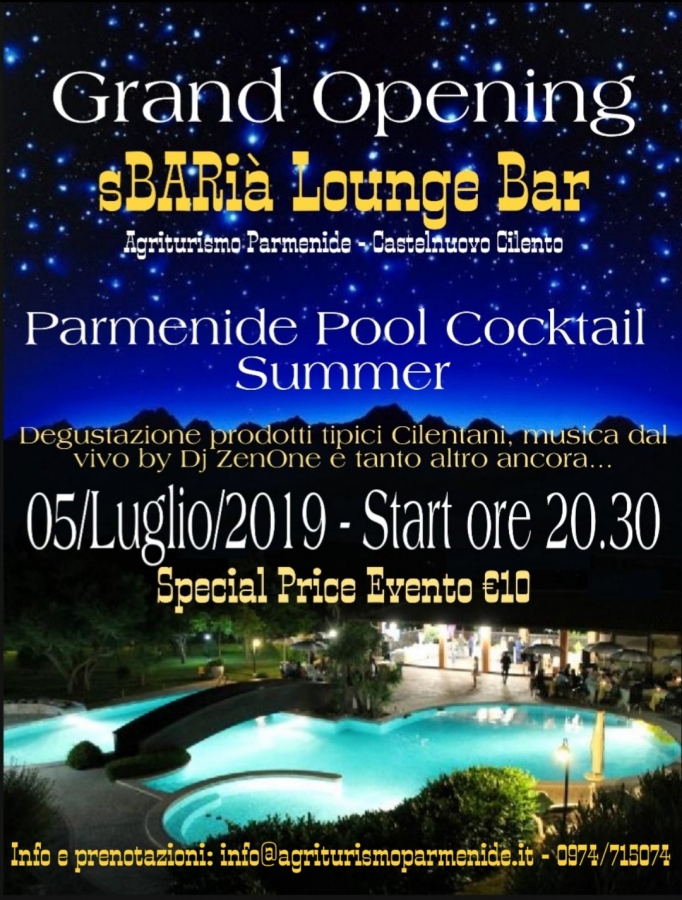 Venerdi, 5 luglio 2019, ore 20,30, presso l’Agriturismo Parmenide, splendida struttura polifunzionalea Casalvelino (SA), nel cuore del Parco del Vallo di Diano e degli Alburni e sede del Centro di formazione professionale dell’Arte del pizzaiolo napoletano e di esperti della Dieta Mediterranea, entrambi patrimonio immateriale UNESCO, si svolgerà“Parmenide Pool Cocktail Summer”, il primo evento di inizio estate 2019 per l’inaugurazione di“sBARià”,Lounge bardall’innovativoconceptdedicato all’arte della Mixology e del Food, che punta a divenire riferimento del settore food&beverageper chiunque ami scoprire un nuovo modo di bere, legato al territorio, ai prodotti cilentani di qualità, in un contesto suggestivo, a bordo piscina, con eccellente musica di sottofondo e la possibilità di abbinare in pairing tanto piccoli finger food, quanto light lunch o cenare nel delizioso ristorantino “Zenone” sulla piscina, scegliendo tra la pizza, certificata ”Pizza Verace Napoletana” del pizzaiolo Giovanni o i piatti tipici della tradizione a base di prodotti a KM0 dell’agriturismo curati dallo Chef del Parmenide, Antonio Barone.