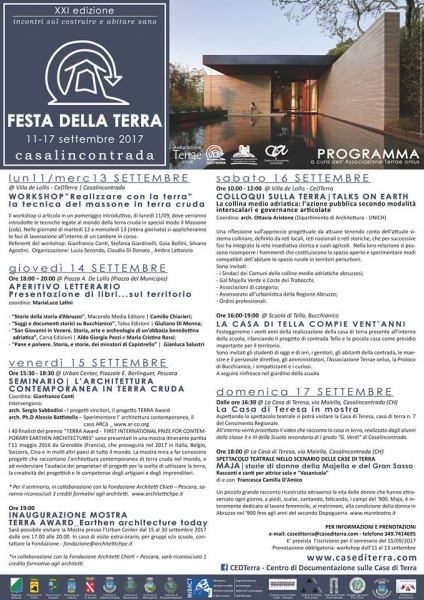 Per continuare lo studio e la conoscenza dal 14 settembre, preceduto da un workshop, tenutosi dall’11 al 13 settembre, sulla conoscenza e la realizzazione dell’impasto di terra chiamato massone utilizzato per la costruzione delle case di terra, si parte con la XXI^ edizione della Festa della Terra – Vivere sano abitare sano, fino al 17 settembre con molti ospiti e tanti argomenti che verranno discussi durante la manifestazione.