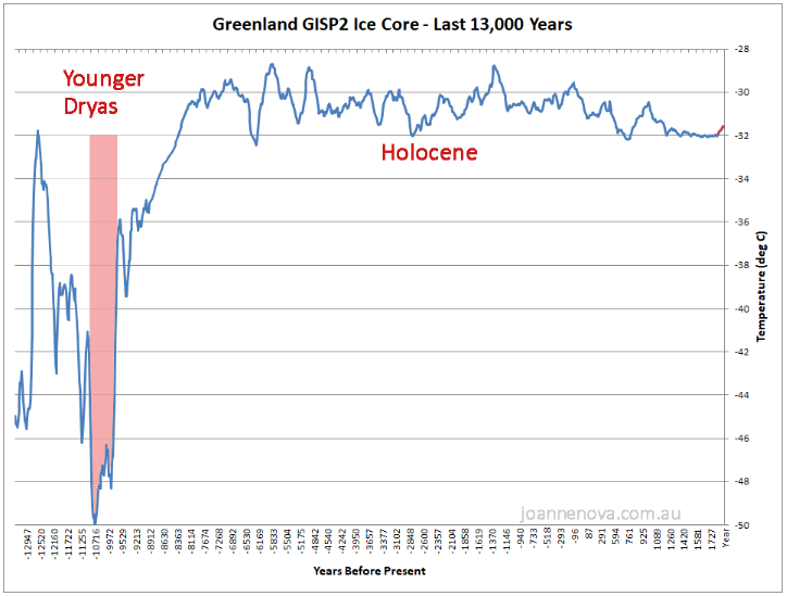 Con l'intenso riscaldamento climatico al termine della glaciazione, in un periodo definito“interstadiale Alleröd”, circa tredicimila anni fa, il quadro iniziava a cambiare profondamente. Lentamente, i ghiacciai della Laurentide e della penisola scandinava si assottigliavano e arretravano. Il ritiro delle immense masse glaciali scopriva grandissimi laghi continentali in grado di incidere sui climi regionali. Le acque di fusione americane ed europee venivano riversate in grandi quantità sull'oceano Atlantico. In Europa i ghiacci avevano scoperto le isole britanniche, e in luglio le temperature arrivavano a 12 gradi. Avanzavano sempre di più i boschi di betulle, indice di un clima temperato-freddo. Il mondo si stava repentinamente scaldando. Forse troppo.