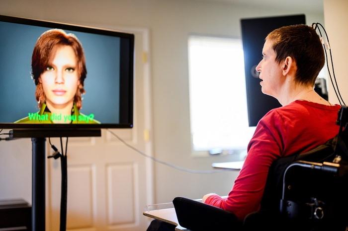 In uno studio clinico condotto da ricercatori dell'Università della California, Berkeley e San Francisco, un impianto posizionato nell'area del cervello responsabile della produzione del linguaggio rileva i segnali generati quando un paziente tenta di parlare. Questi segnali vengono trasmessi a un computer connesso, dove vengono convertiti in testo, audio o espressioni facciali da un'intelligenza artificiale. Inizialmente funzionante con un ritardo di otto secondi, il sistema è stato aggiornato nel 2025 per rispondere in un solo secondo.