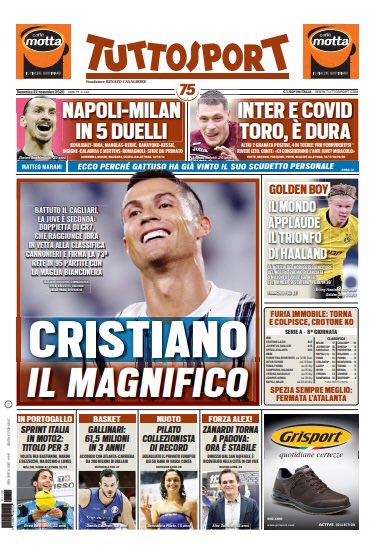 Apertura di TUTTOSPORT dedicata alla Juventus e a Cr7: "Cristiano il Magnifico". Battuto il Cagliari con una rete di CR7, juve seconda. Il portoghese raggiunge Ibra in vetta alla classifica cannonieri. Sono 73 reti in 95 partite con la maglia bianconera.