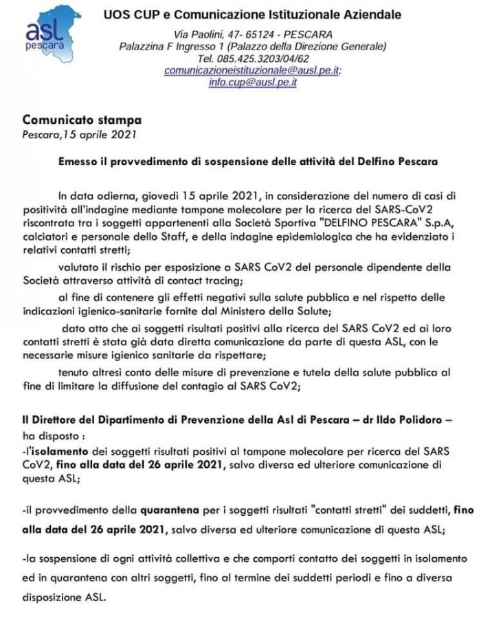 La ASL (Azienda Sanitaria Locale) ha bloccato il Pescara. Ad ufficializzare la notizia è stata l’Azienda stessa attraverso un comunicato a causa dei tanti positivi all’interno della squadra (7 calciatori ed un membro dello staff), costringendo la società a fermare le attività agonistiche dal 15 fino al 26 aprile, rinviando le prossime 3 partite del Delfino, ovvero Entella (sabato 17 allo stadio Adriatico), Cosenza (martedì 20 aprile allo stadio Marulla) e Reggiana (sabato 24 aprile all’Adriatico).