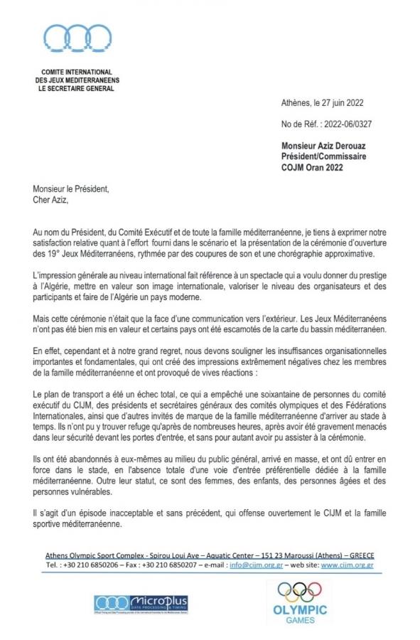 La lettera di protesta firmata dal Segretario Generale, Iakovos Filippousis, e indirizzata al Presidente-Commissario del Comitato Organizzatore dei Giochi del Mediterraneo, mette in luce "le significative e fondamentali carenze organizzative durante la cerimonia di apertura", che hanno "creato estremamente impressioni negative tra i membri della Famiglia Mediterranea e ha provocato forti reazioni".