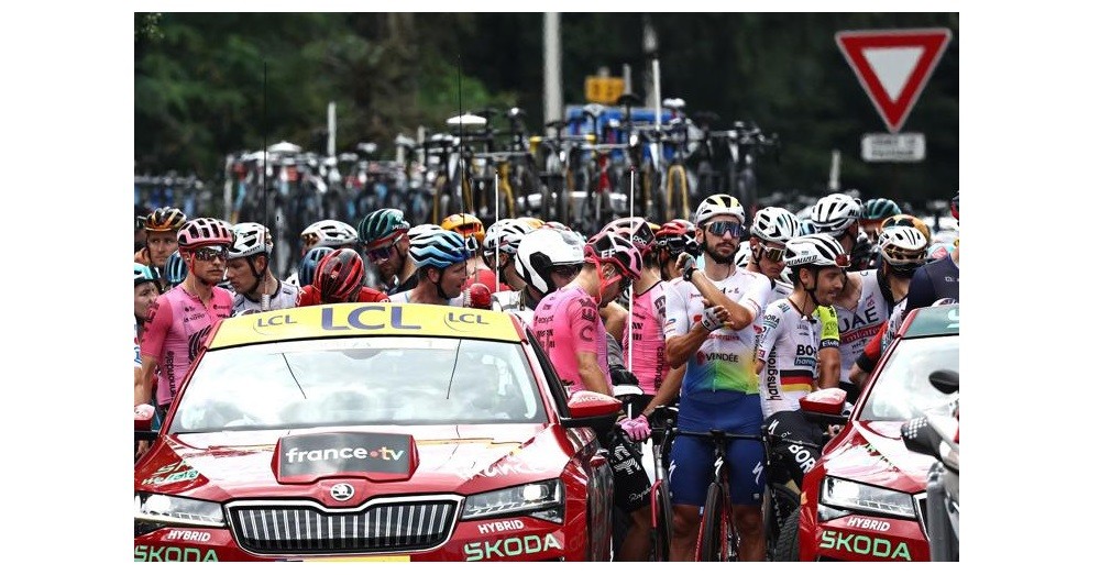 Il Tour de France 2023 è ripartito dopo la maxi caduta di gruppo a causa dell'asfalto bagnato dopo 5,5 km della 14esima tappa, da Annemasse a Morzine Les Portes du Soleil di 152 km.