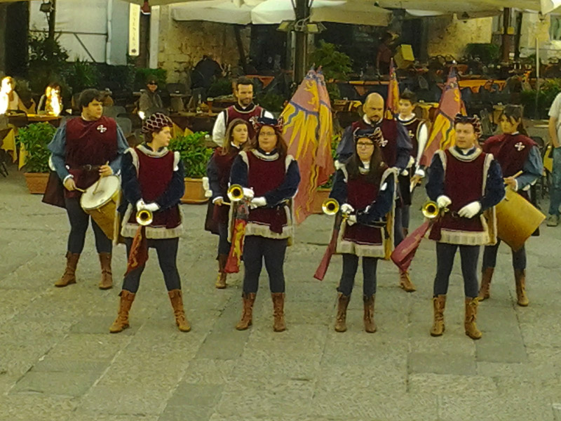 Veniamo accompagnati nella piazza principale. A nostro parere una delle più belle d'Italia. Con il duomo, il palazzo del Podestà e il municipio. Ci fanno parcheggiare e sedere sulla scalinata del duomo. Ora abbiamo capito. Stanno arrivando gli sbandieratori. Solo per noi! Come si fa a non emozionarsi. Mj vengono i brividi solo a ripensarci mentre sto scrivendo questo articolo. I tamburi attirano moltissime persone. Eccoli. Arrivano. Un ragazzino di tredici anni si esibisce con ben 4 bandiere. Siamo stupiti tutti. La sua bravura è particolare e... innaturale per noi che non conosciamo queste manifestazioni.