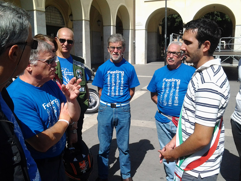 La nostra staffetta dei Motociclisti delle Forze Armate è puntuale. Ci accompagna dal sindaco di Pomezia percorrendo una via Ardeatina che necessita di molte attenzioni. Asfalto sconnesso. Lavori in corso. Traffico intenso. Antonio, presidente Amfa, per evitare un incidente, cade ma senza conseguenze grazie anche alla prontezza di riflessi di Mariela, da lui trasportata, che blocca la caduta della sua Bmw Gs. Dimenticavo di dire che la nostra donzella ci ha raggiunto a Roma per un paio di giorni. Coccolata e curata dagli amici Amfa.
