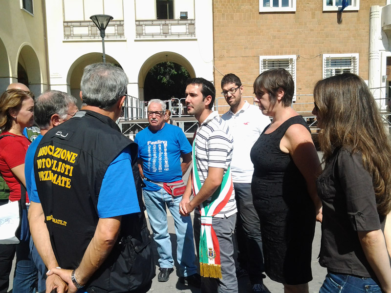 L'incontro con il sindaco e alcuni assessori di Pomezia è particolare. Sia per la giovane età , 34 anni, di una forza politica emergente, sia per il luogo. La piazza del comune. Qui è evidente l'opera del Duce. Un palazzo riporta la scritta 'A. XVII E. F.' (anno diciassettesimo dell'era fascista). Dopo un aperitivo e aver soddisfatto la curiosità del primo cittadino e di molti passanti, salutiamo la nostra scorta e Mariela poiché li attende un importante impegno a Roma. Ne parleremo dopo. Ci riposiamo in un fast food in attesa della nostra staffetta che ci accompagnerà a Cisterna. Nel frattempo ci raggiunge Fabrizio, riceviamo molte telefonate, tra cui Cau, rispondiamo alla Questura di Chieti e ci riposiamo un pochino.