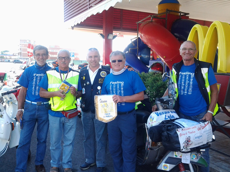 Qui capiamo cosa significa essere ben organizzati, affiatati e, soprattutto, AMICI per la VESPA. Veniamo ospitati dal Comune in una struttura con campi da gioco di vario genere, cavalli, piscina, ristorante. Una estensione enorme. Ed è qui che faremo la cena con oltre 50 invitati. Ed è qui che riceveremo il contributo per Angsa. Nel frattempo dobbiamo risolvere un problema piuttosto spiacevole e che ci delude molto. Mariela, a Roma con i motociclisti Amfa, avrebbe dovuto intervenire al teatro Globe a Villa Borghese, insieme alla presidente Angsa del Lazio, alla presentazione del nostro giro. Una platea di circa 1.000 persone! La presidente rinuncia all'invito ancorché avvertita da giorni. Come si fa a non approfittare di un'occasione così unica? Bisogna correre ai ripari. Indichiamo a Mariela ciò che deve dire, la tranqullizziamo, la rassicuriamo e... speriamo bene.