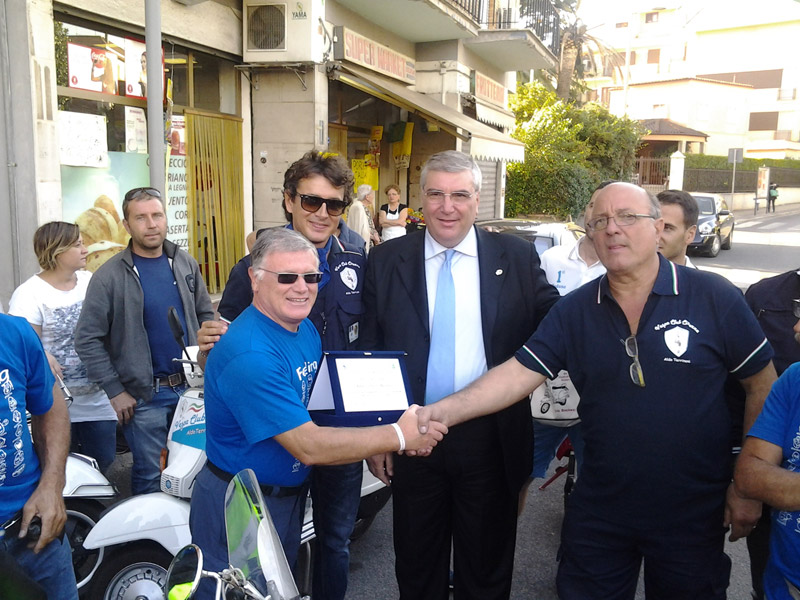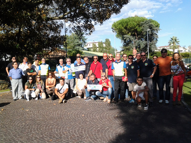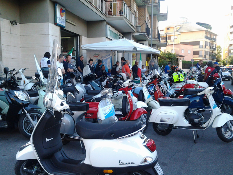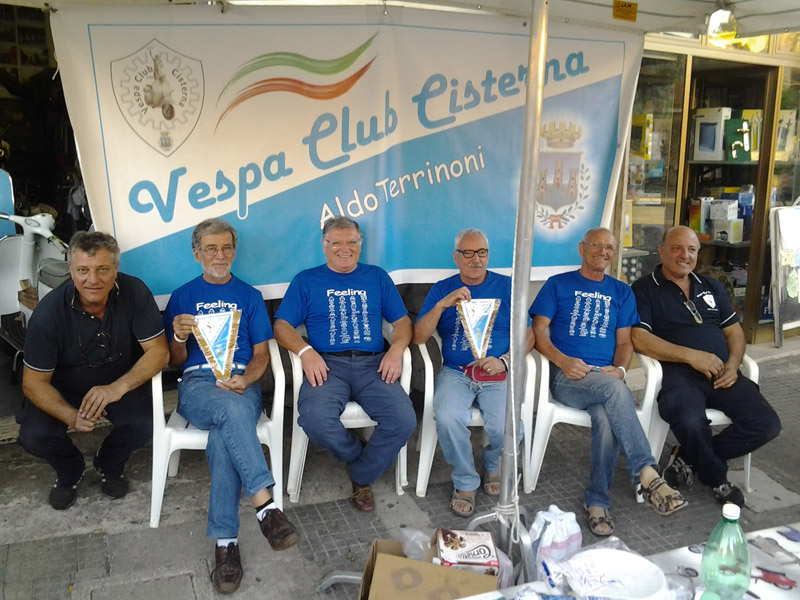 La staffetta arriva. Numerosa ed entusiasta. Il viaggio fino a Cisterna è simile al mattino. Sempre traffico. Sempre buche. Tra di loro vi è anche un rappresentante del Vespa Club Aprilia che, insieme a Fabrizio, ha scritto a 6 mani il libro di Cau. L'arrivo in città ci stupisce ed emoziona nuovamente. Se va avanti così avremo bisogno di un cardiologo!