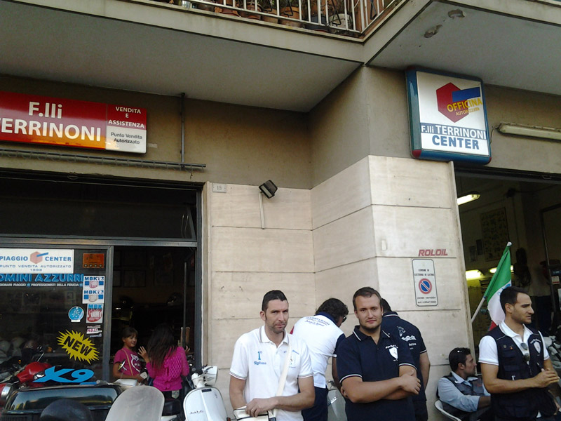 Giro per le vie cittadine e arrivo alla più antica officina di Cisterna. Oltre 70 anni di gestione da parte della stessa famiglia. Di padre in... figli. Vi è il sindaco con alcuni assessori (ma siamo così importanti?). Moltissime persone. Uno scambio di gagliardetti. Un piccolo ristoro. Molte foto. Facciamo fatica a contenere la gioia del loro presidente. È una persona simpaticissima, attivissima. Cosi come i due ragazzi ai quali ha affidato la responsabilità della nostra gestione.