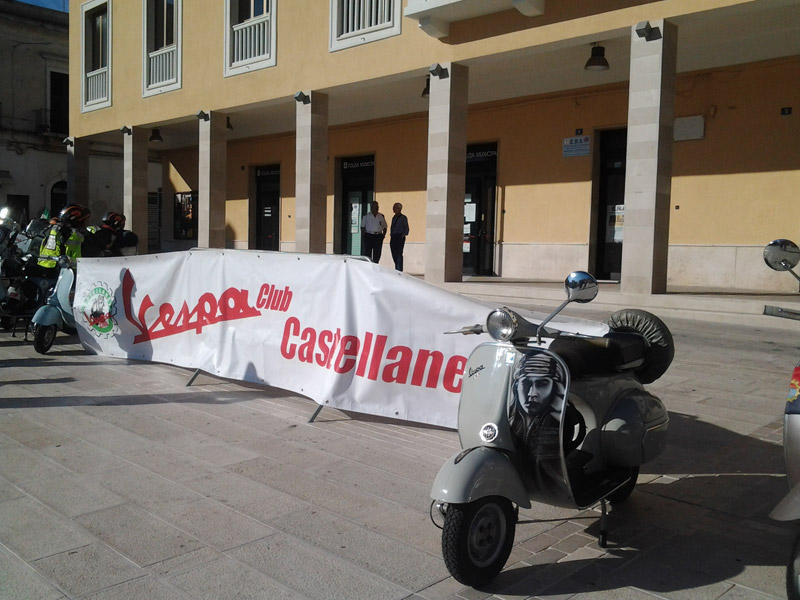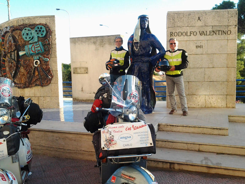 Castellaneta non era prevista come sosta, come altre d'altronde, ma ci rechiamo volentieri. Non possiamo lasciarci scappare l'occasione di visitare il paese di Rodolfo Valentino. Chissà , magari ci trasmette qualcosa del suo fascino! Ci ricevono il Vespa Club locale e il vice sindaco. Veramente simpatico e interessato.